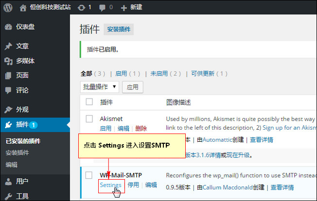 安裝并啟用WP Mail SMTP 插件后,進入插件列表,點擊WP Mail SMTP插件下的“Settings”進行設置。