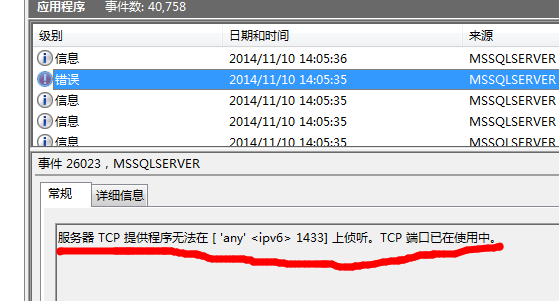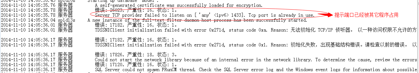 在這個(gè)過程中最常出現(xiàn)的問題就是,1433端口被其它程序占用,這樣就導(dǎo)致TCP/IP協(xié)議無法正常啟動(dòng),這樣我們會(huì)看到如下日志信?