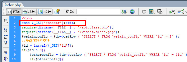 第五,在mobile/weixin/index.php文件下增加代碼:echo $_GET['echostr'];exit;,如圖:(注意:提交成功后撤銷剛才添加的代碼)